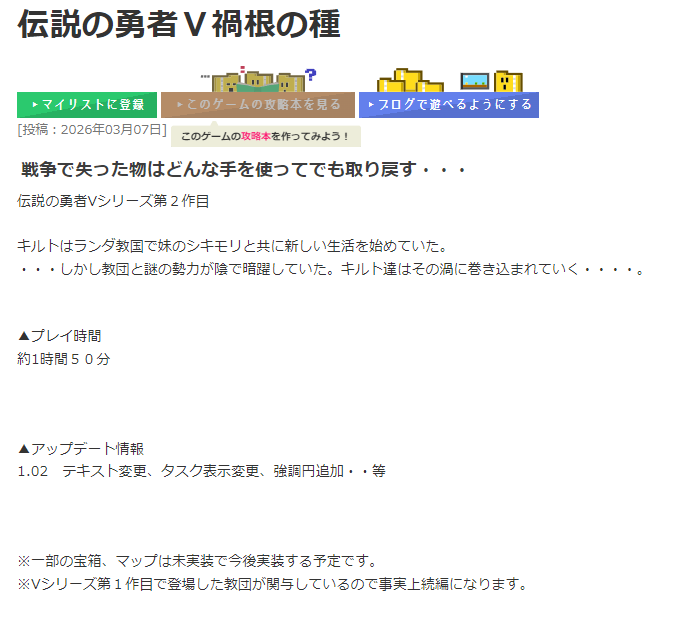 プリシーに投稿しました。 ゲーム制作 2026.03.14 プリシーにV2禍根の種を公開しました。さっそくコメントがつきました!ちょっと分かりづらい所があったみたいなので修正しておきます。 ↑重要部分を赤文字に変更